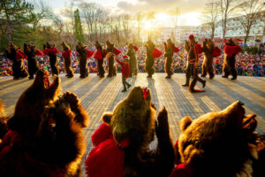 கரடி தாடைகள் மற்றும் நகங்கள் அணிவகுத்து நடனமாடும் ஆடைகளில் உள்ள மக்களின் வரிசைகளைக் கொண்ட இந்த காட்சியைக் காண ஜப்பான் வரை இருந்து பார்வையாளர்கள் வருகிறார்கள். ராட்சத சிவப்பு பாம்பாம் அலங்காரங்கள் பொதுவாக உரோமங்களில் சேர்க்கப்படுகின்றன. சில “கரடிகள்” வேடிக்கையாக உறுமுகின்றன அல்லது பார்வையாளர்களைத் தாக்குவது போல் நடிக்கின்றன.