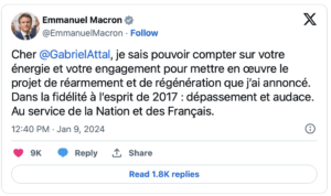 மக்ரோனின் அலுவலகம் ஒரு அறிக்கையை வெளியிட்டுள்ளது. கேப்ரியல் அட்டல் அரசாங்கத்தின் செய்தித் தொடர்பாளராகவும் கல்வி அமைச்சராகவும் பிரபலமடைந்தார். அவர் பிரான்சின் முதல் வெளிப்படையான ஓரினச்சேர்க்கை பிரதமர் ஆவார்.